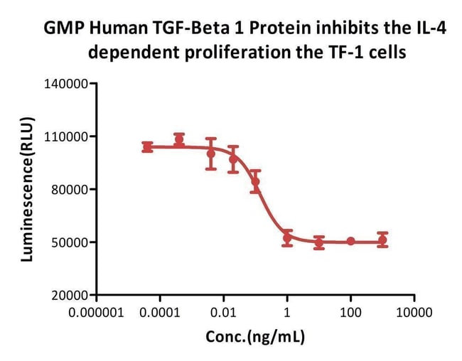 | Biological Activity | GMP Human TGF-Beta 1 Protein (Cat. No. GMP-TG1H25) inhibits the GMP Human IL-4 Protein (Cat. No. GMP-L04H26) dependent proliferation the TF-1 cells. The specific activity of GMP Human TGF-Beta 1 Protein is >6.00x10^6 IU/mg, which is calibrated against transforming growth factor β1 (NIBSC code:89/514) (QC tested).∣The activity of GMP Human TGF-Beta 1 Protein (Cat. No. GMP-TG1H25) was higher than other competing products.∣GMP Human FGF basic Protein (Cat. No. GMP-FGCH17) and GMP Human TGF-Beta 1 Protein (Cat. No. GMP-TG1H25) could maintain the stemness of hiPSCs with high expression of stem cell genes OCT4, SOX2, and SSEA4 with GMP Human Laminin 521 Protein (Cat. No. GMP-LA5H24).∣The Cell based assay shows that GMP Human TGF-Beta 1 Protein (Cat. No. GMP-TG1H25) is stable at 37°C for 24 hours.∣The Cell based assay shows that GMP Human TGF-Beta 1 Protein (Cat. No. GMP-TG1H25) is stable at 4°C for 180 days.∣The Cell based assay shows that GMP Human TGF-Beta 1 Protein (Cat. No. GMP-TG1H25) is stable after freezing and thawing 3 times.∣The Cell based assay shows batch-to-batch consistency between Acro's GMP and PG TGF-Beta 1. |